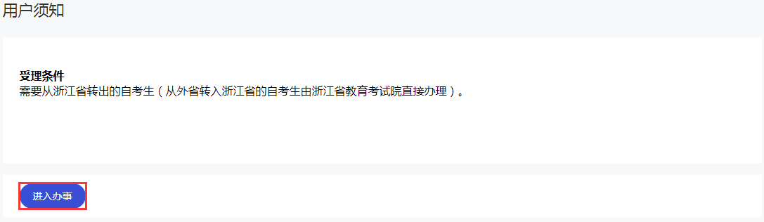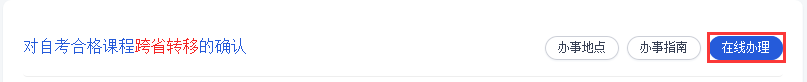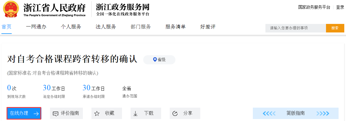 登錄浙江政務服務網(www.zjzwfw.gov.cn)[可通過浙江省教育考試院官網(www.zjzs.net)“最多跑一次-自考合格課程跨省轉移確認申請”或浙江省教育考試院自學考試信息網(zk.zjzs.net)“我的申請-轉考申請”鏈接]
