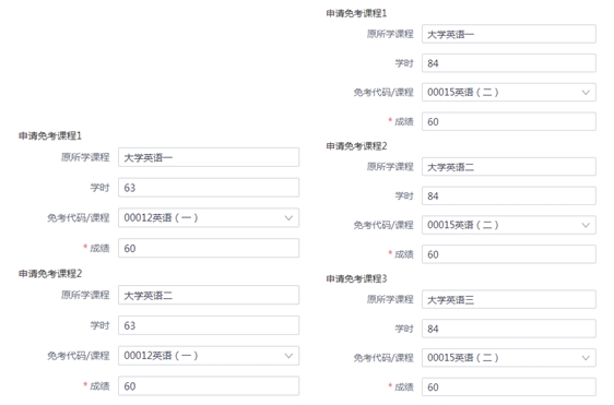 以高校在校期間學(xué)期英語(yǔ)合格成績(jī)來(lái)申請(qǐng)免考“00012英語(yǔ)(一)”或“00015英語(yǔ)(二)”的,提交的“ ”上英語(yǔ)課程必須有明確的學(xué)期區(qū)分,并達(dá)到要求的學(xué)期數(shù)。在填寫(xiě)免考課程信息時(shí),“原所學(xué)課程”“成績(jī)”需填寫(xiě)2個(gè)學(xué)期或3個(gè)學(xué)期實(shí)際英語(yǔ)課程名和成績(jī),原所學(xué)英語(yǔ)課程沒(méi)有注明學(xué)時(shí)的,免考“00012英語(yǔ)(一)”的填“63”、免考 “00015英語(yǔ)(二)”的填“84”。