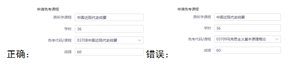 5.“原所學(xué)課程”與申請(qǐng)免考的“免考代碼/課程”須相符,不能按已廢止的頂替規(guī)定來(lái)申請(qǐng)免考,即學(xué)的什么課程免考什么課程。否則會(huì)導(dǎo)致課程免考審批不通過(guò)。如:考生想申請(qǐng)免考“03708中國(guó)近現(xiàn)代史綱要”,“原所學(xué)課程”填寫(xiě)是“中國(guó)近現(xiàn)代史綱要”,申請(qǐng)免考的“免考代碼/課程”卻填寫(xiě)是“03709馬克思主義基本原理概論”,兩者不符,“03708中國(guó)近現(xiàn)代史綱要”就不能免考。