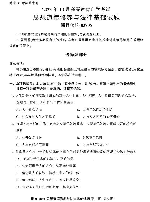 2023年10月浙江自考思想道德修養(yǎng)與法律基礎(chǔ)真題03706