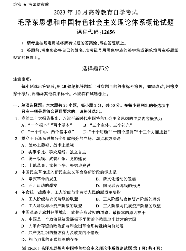 2023年10月浙江自考毛澤東思想和中國特色社會主義理論體系概論真題12656