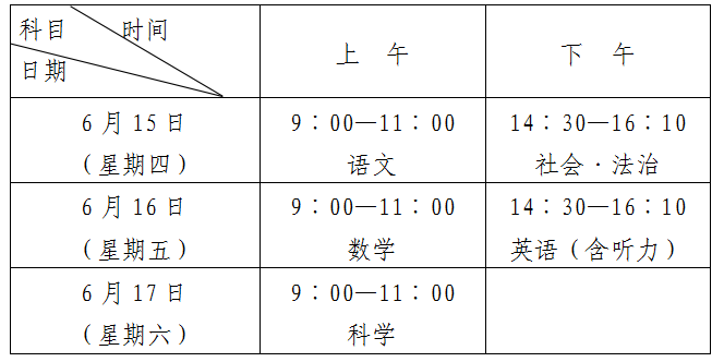 1.考試科目:語文、數學、英語(含聽力)、科學、歷史與社會·道德與法治(簡稱社會·法治,下同)共五門。