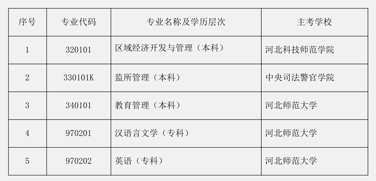 一、區域經濟開發與管理(本科)、監所管理(本科)、教育管理(本科)、漢語言文學(專科)、英語(專科)5個專業從2023年開始實施停考,不再接受新考生(含其他專業在籍考生)報名報考。