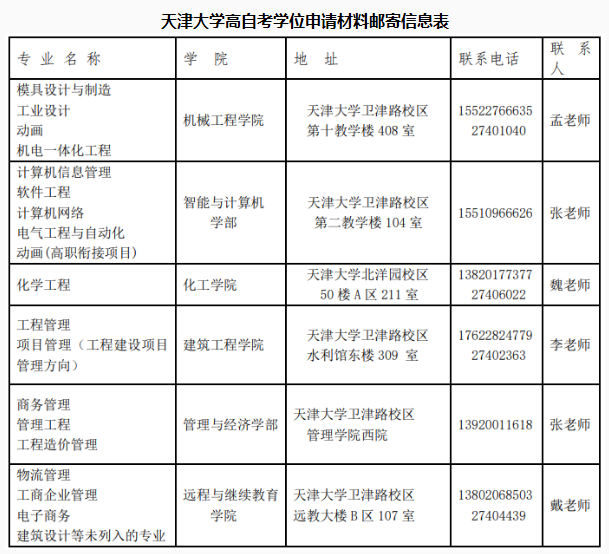 具體收件地址、聯系人、電話等信息詳見下表,請考生按照申請學位專業選取地址進行郵寄。