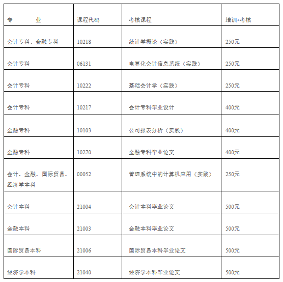 浙江財經大學高教自考實踐課程培訓、考核收費標準明細表: