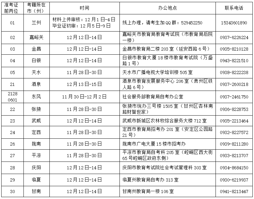 附:2022年下半年甘肅省高等教育自學考試社會型考生各市州畢業初審時間及聯系方式