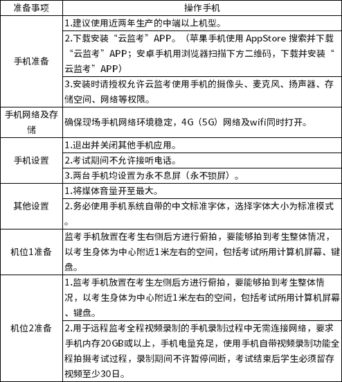 3.智能手機1(第一機位):下載安裝“云監考”APP,用于學校遠程監考。要求手機網絡環境穩定,手機電量充足,設置為永不息屏。因考試時間較長,建議監考手機處于持續充電狀態。錄制期間如有電話或短信錄像會斷開,建議設置呼叫轉移或開啟飛行模式。如中途斷開,學校累計3分鐘無法監控到考生考試情況將視為考生作弊。
