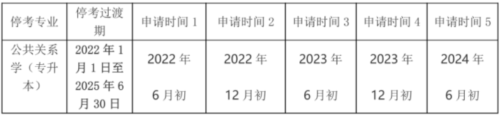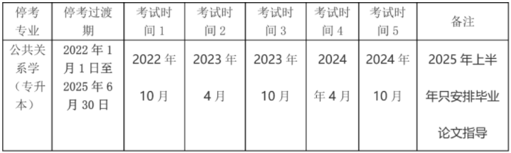 7.公共關系學(本科)停考過渡結束時間順延半年,具體考試安排見下表: