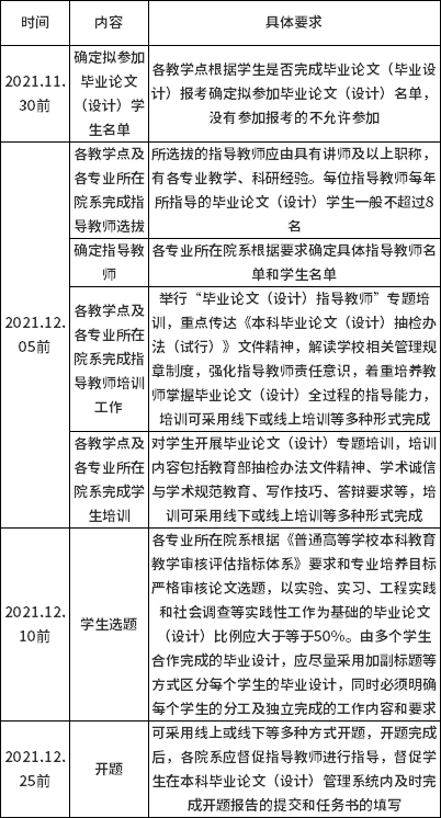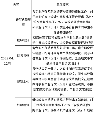 各專業所在院系應于中期檢查結束后2月內完成畢業論文(設計)撰寫,并按學校要求開展畢業答辯工作,具體要求如下: