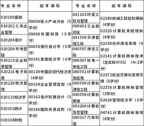 其中,020213企業財務管理、020115經濟學、020102統計、020104財稅、081103環境工程與管理、080603工業自動化、081704交通管理工程、080708計算機通信工程、082208計算機信息管理等專業已停考,上述??紝I涉及的相關課程不再安排考試。