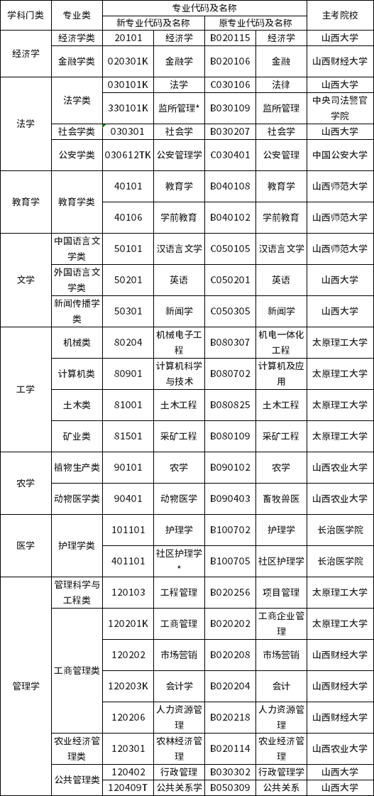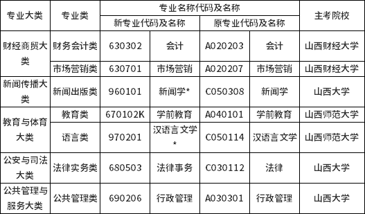 此次,專業名稱及代碼的調整原則上按教職成廳[2018] 1號文件中《高等教育自學考試新舊專業對照表》進行,山西省高等教育自學考試新舊專業名稱及代碼調整對照表見附件。