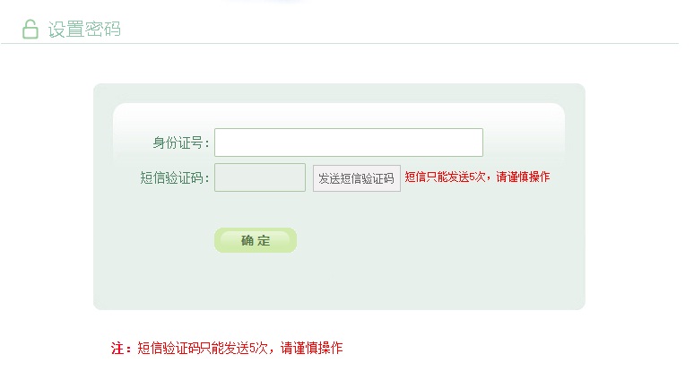 輸入身份證號(hào),點(diǎn)擊“發(fā)送短信驗(yàn)證碼”按鈕后,系統(tǒng)會(huì)隨機(jī)發(fā)送6位數(shù)字驗(yàn)證碼至考生報(bào)名時(shí)所填的手機(jī)號(hào)上(即在安徽政務(wù)服務(wù)網(wǎng)上注冊(cè)時(shí)填寫的手機(jī)號(hào)碼);填寫完短信驗(yàn)證碼,點(diǎn)擊“確定”,跳轉(zhuǎn)至考生修改密碼頁面,設(shè)置考生登錄密碼。短信驗(yàn)證碼只能發(fā)送5次,請(qǐng)勿短時(shí)間重復(fù)發(fā)送驗(yàn)證碼。